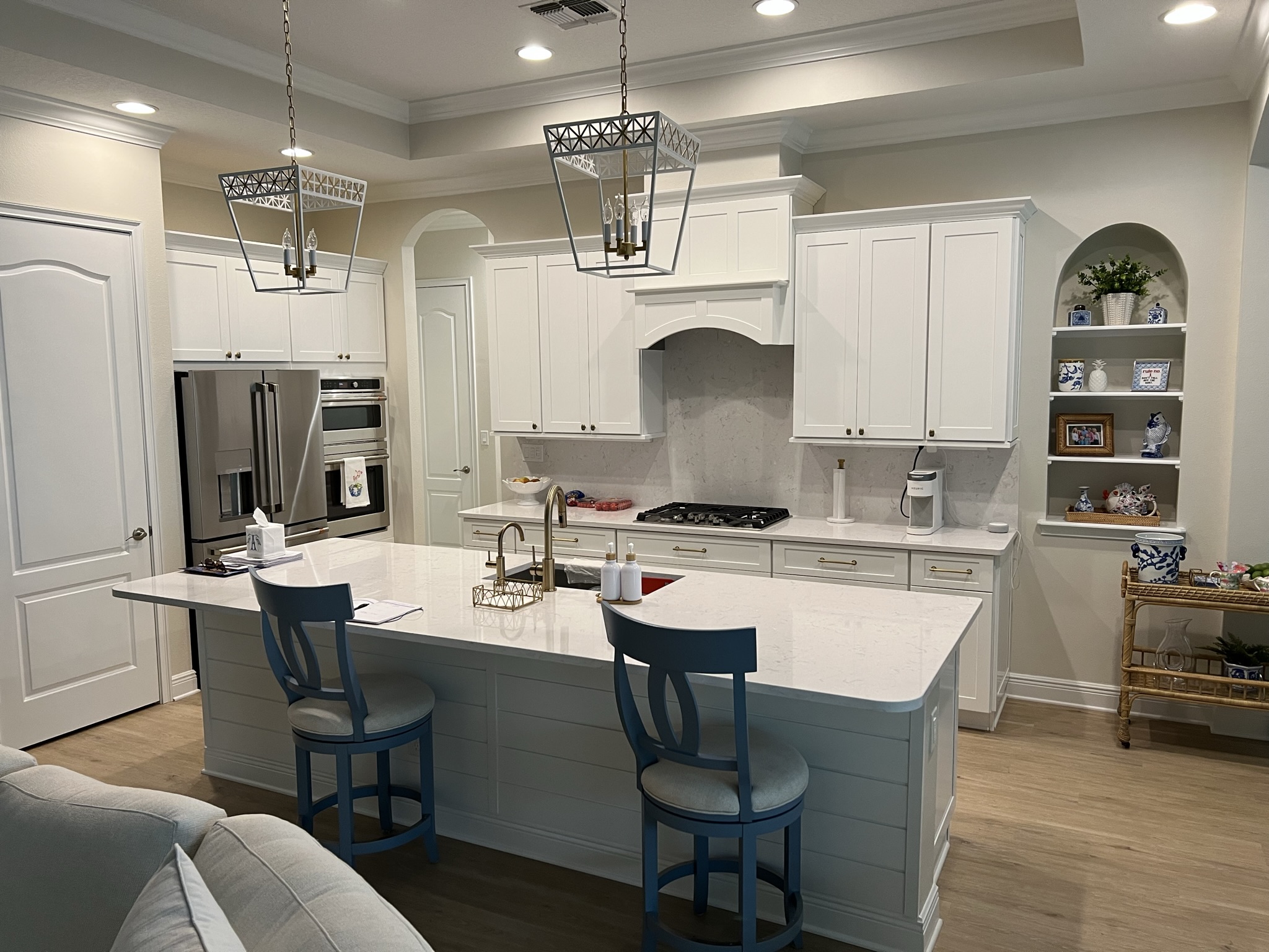 Kitchen Remodel with Custom Hood and Full Height Quartz Backsplash.